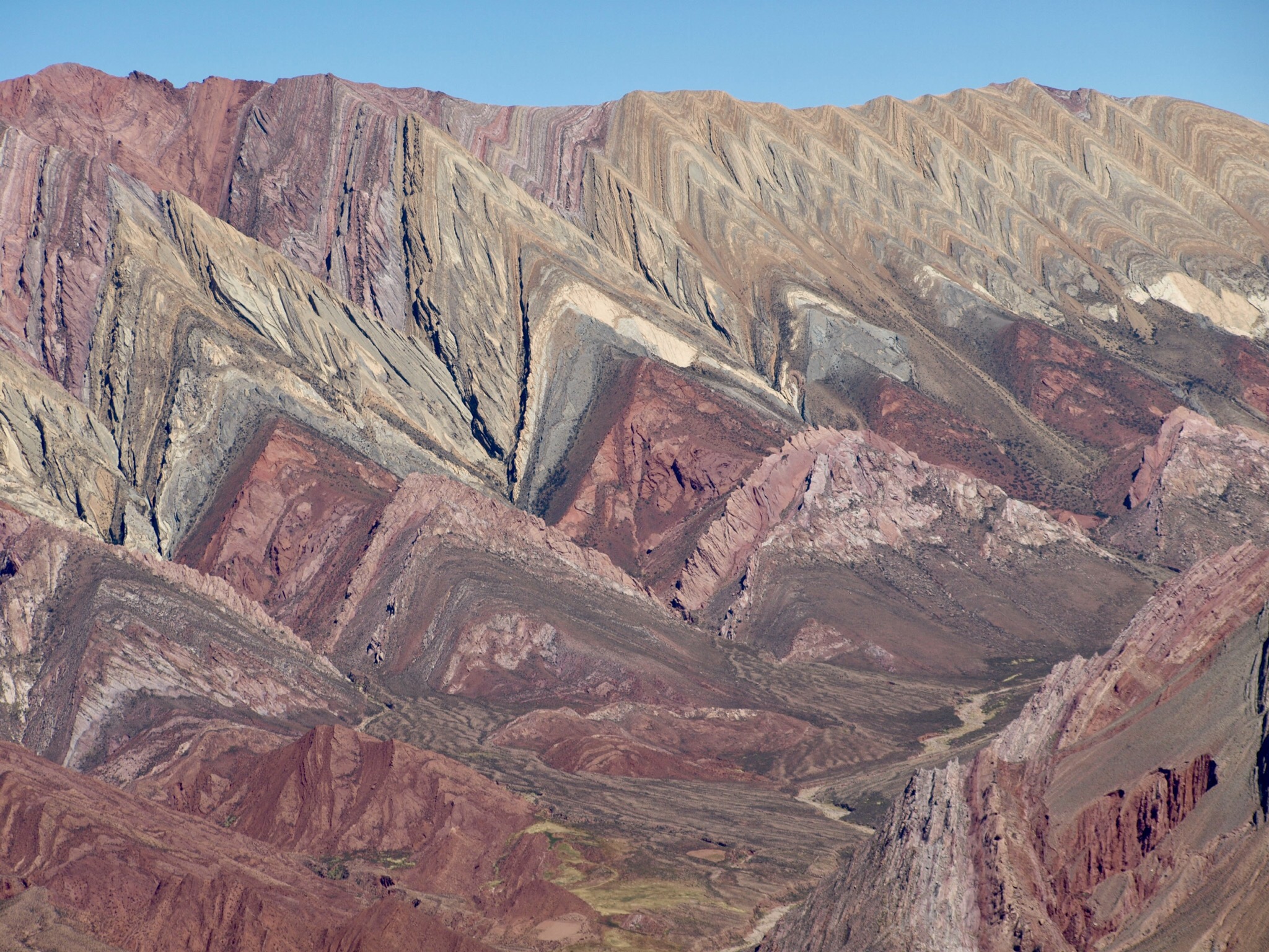 Nous poursuivons jusqu’à Humahuaca où nous allons, à 4350 m d’altitude, au bout d’une piste poussiéreuse, admirer le site d’El Hornocal, montagne aux 14 couleurs. Il se mérite ! Tout le monde a bien supporté l’altitud, ce qui nous rassure pour les jours à venir. Nous avons rencontré nos premières vigognes (lamas sauvages).
