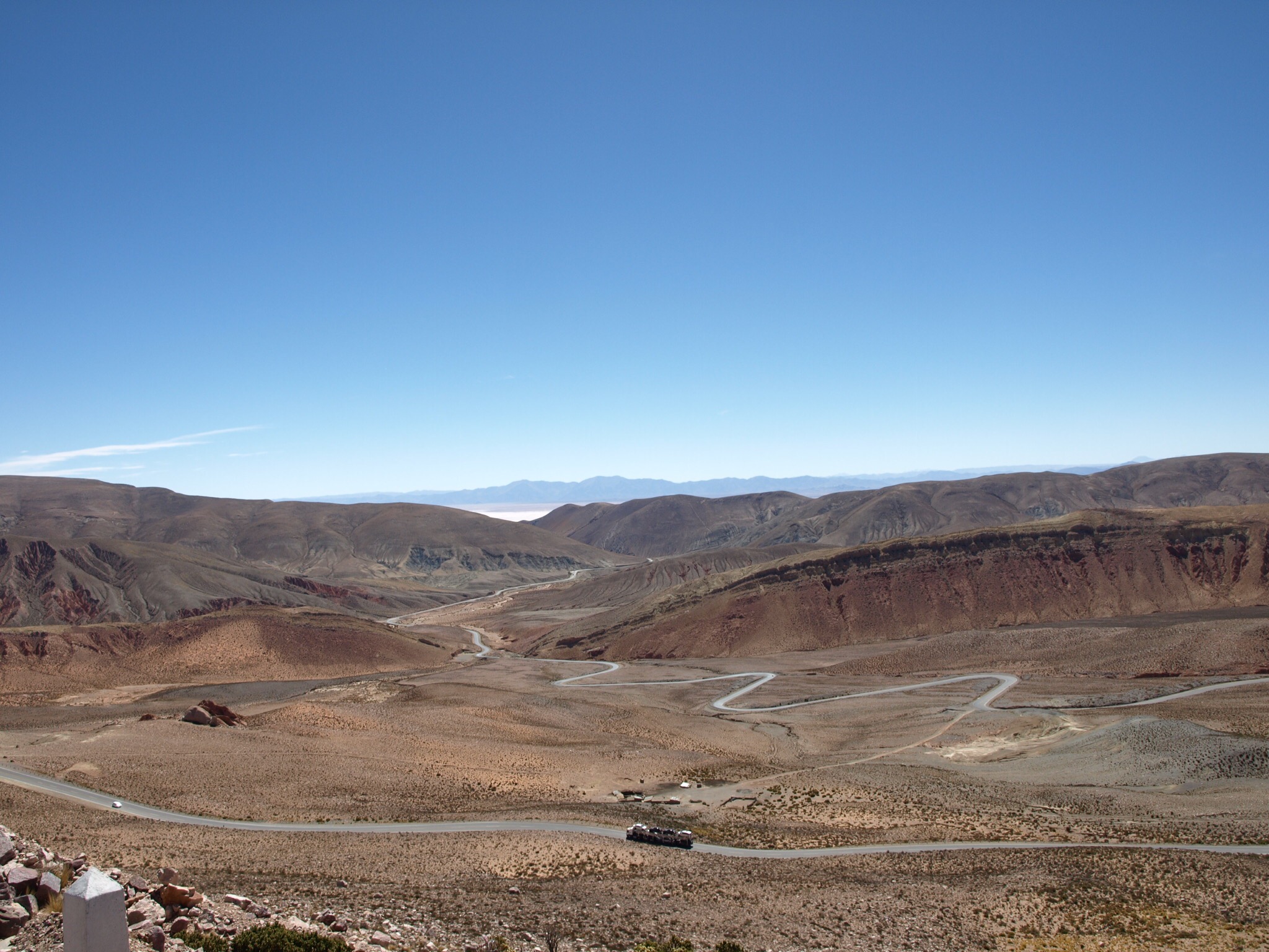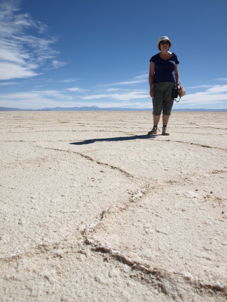 Nous avons quitté Huacalera et sommes repartis vers Purmamarca où nous avons randonné autour de la montagne aux 7 couleurs, dans un paysage magique ! Puis nous avons repris la route vers Susques qui devait être notre étape sur la route du Chili. Mais puisqu’il est interdit d’y aller avec notre voiture de location, nous avons changé nos plans. Nous nous sommes arrêtés aux Salinas Grandes, immense étendue de sel, qui rappelle un peu la Vallée de la Mort, mais il y fait moins chaud !