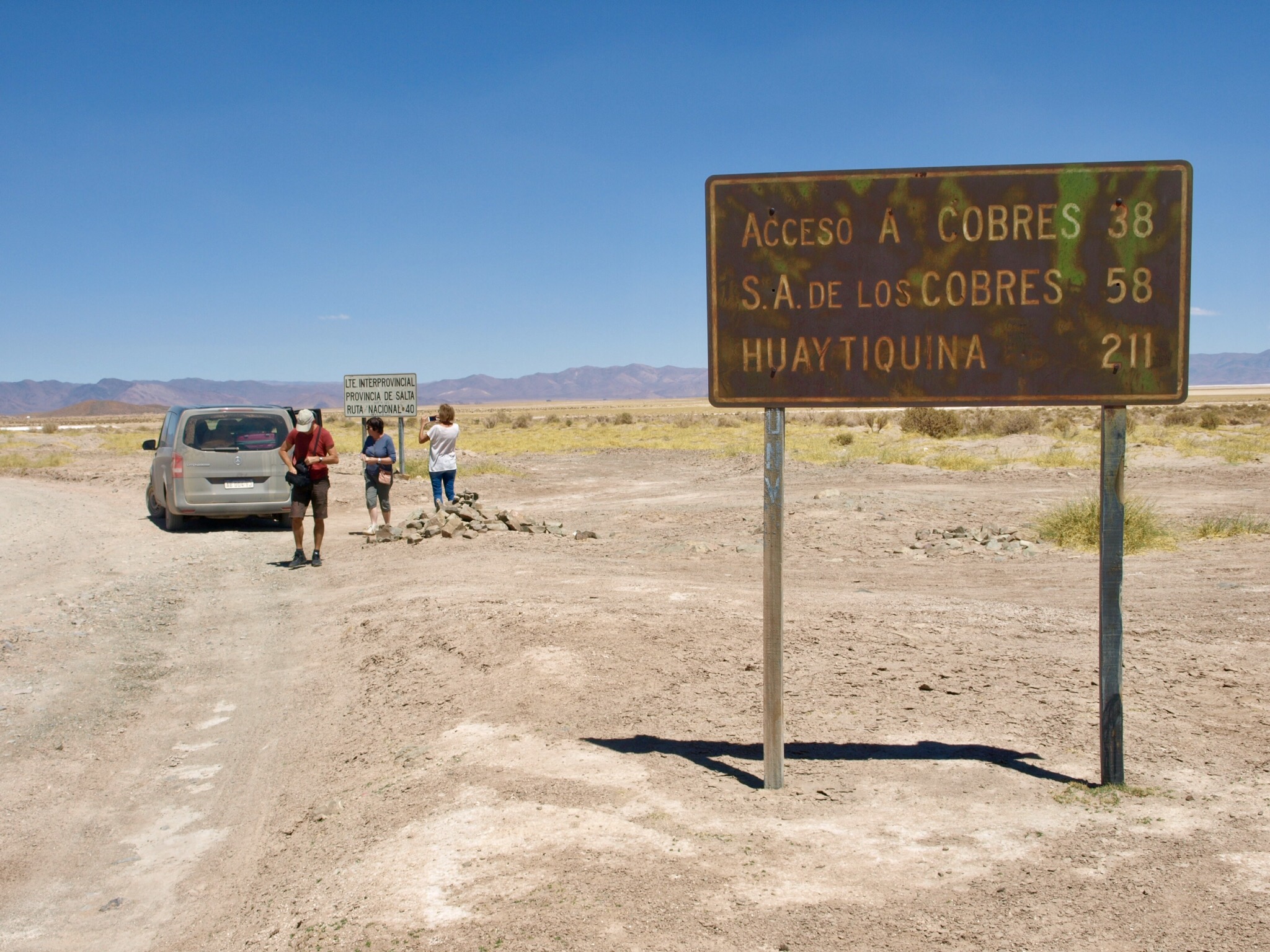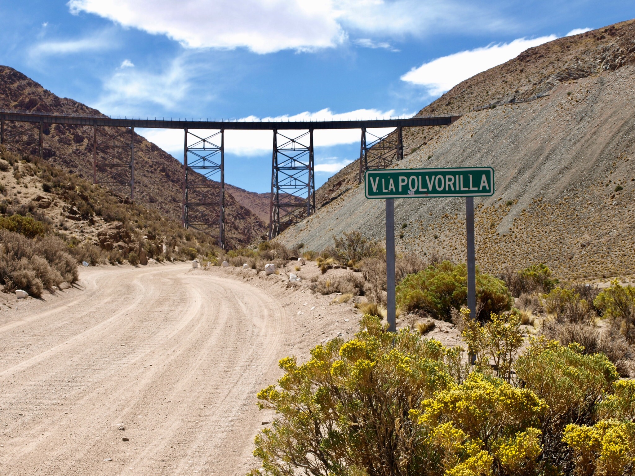 Les tintinophiles reconnaîtront ! Notre destination d’aujourd’hui, après 100 km de piste, est San Antonio de los Cobres, ville sans intérêt, sauf qu’à 18 km (de piste bien sûr) se trouve le viaduc de la Polvorilla, d’où sautent Tintin et Milou dans Le Temple du Soleil. Ce viaduc est à 4220 m d’altitude et mesure 224 m de long, et 64 m de haut. « El tren de las nubes », le train des nuages, est maintenant un train touristique.