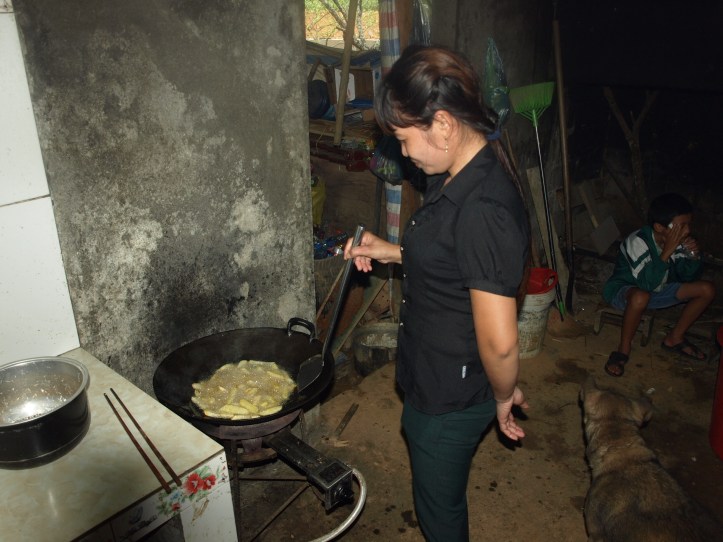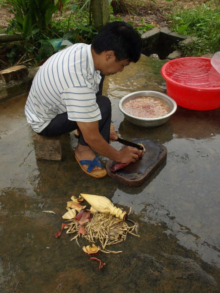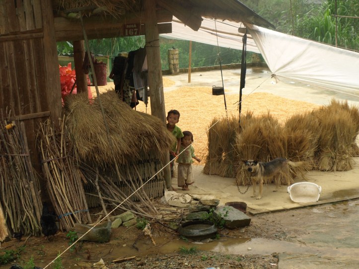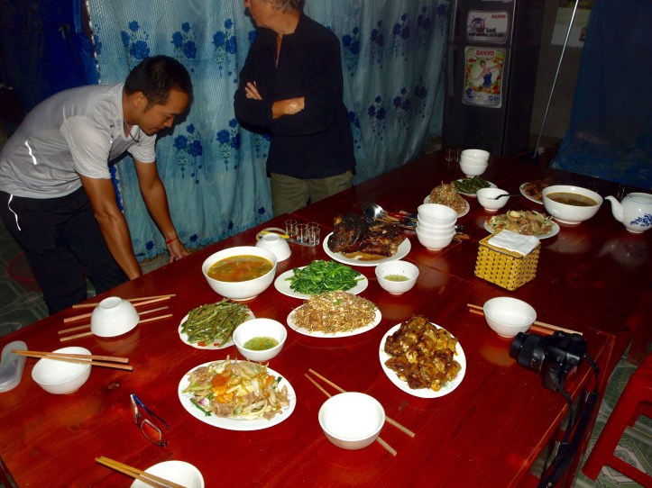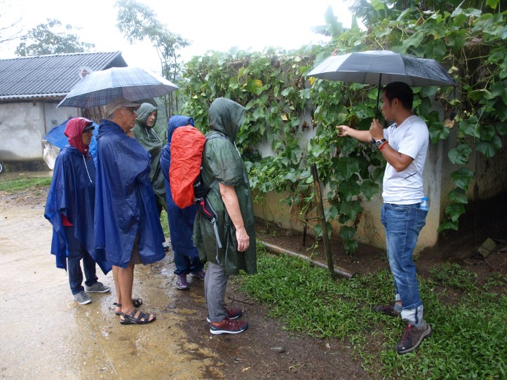 Certains se souviendront d’une semaine de rando sous la pluie incessante… C’est en quittant Hanoï que nous retrouvons la pluie et elle ne nous a pas quittés de la journée ! Dommage car nous attaquons la montagne, la randonnée et la découverte des ethnies du nord- Vietnam. Aujourd’hui, nous avons fait connaissance de Don, notre guide pour 10 jours jusqu’à Ninh-Binh. Nous avons roulé toute la matinée de Hanoï à Bac-Ha, où vivent les Hmongs fleuris (à cause de leur tenue). Bien sûr, comme il pleut, on croise peu de monde au cours de notre balade, mais, demain, nous irons au marché. Nous nous sommes seulement arrêtés dans une ferme où un homme nous a montré la fabrication l’alcool de maïs. Seulement quelques rizières par ici, mais surtout la culture du maïs, avec 2 récoltes par an. C’est donc à pied, et trempés que nous arrivons chez nos hôtes d’un soir, dans une maison au bord de l’eau, où il y a même le wifi comme vous voyez. L’étage comporte trois « chambres « , c’est-à-dire trois matelas, séparés par des rideaux !!! Nous allons dîner tous ensemble, avec, au menu, de la salade de fleurs de bananier, des frites, des nems…..belle perspective !