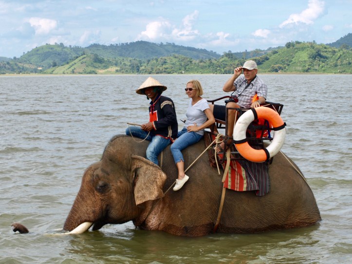 Le clou de la journée fut quand même notre balade à dos d’éléphant, conduits par de jeunes cornacs de l’ethnie Mnong. Ce fut une sacrée expérience ! D’après notre guide, et nous l’avons observé, la relation entre le cornac et l’éléphant est fraternelle, et la fidélité mutuelle est remarquable.