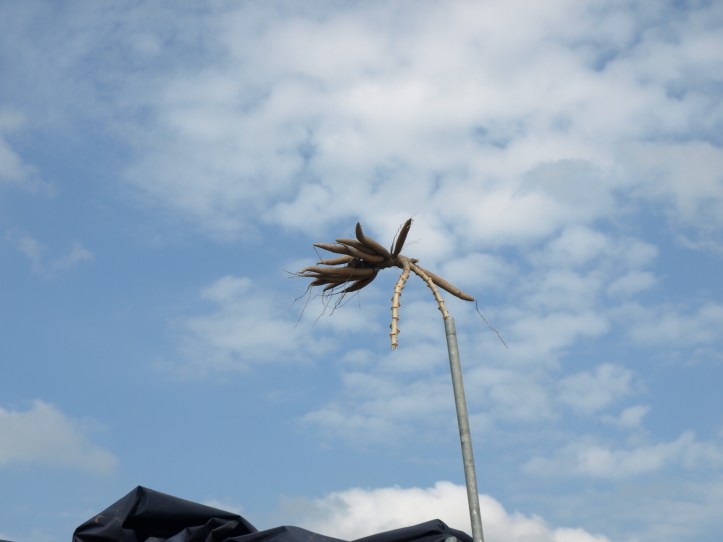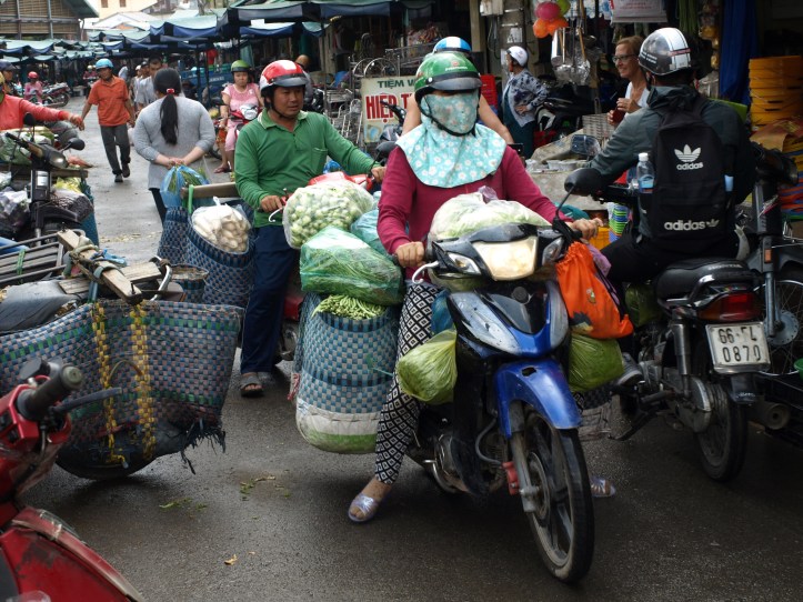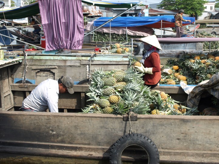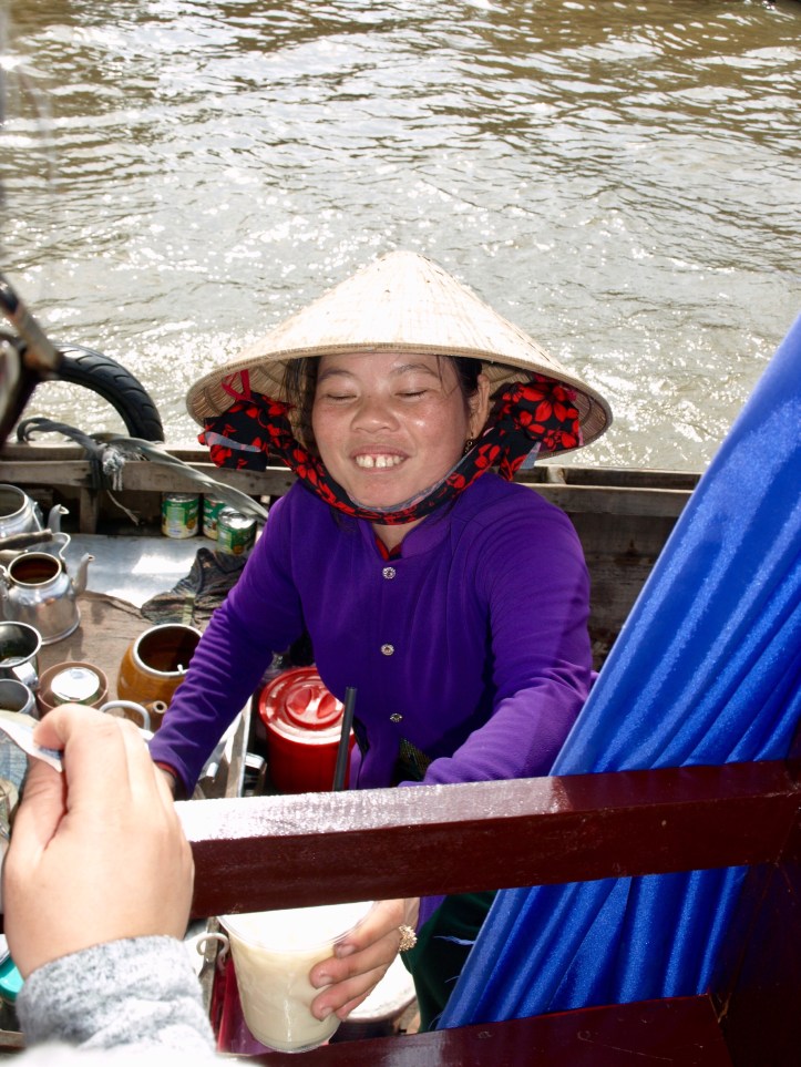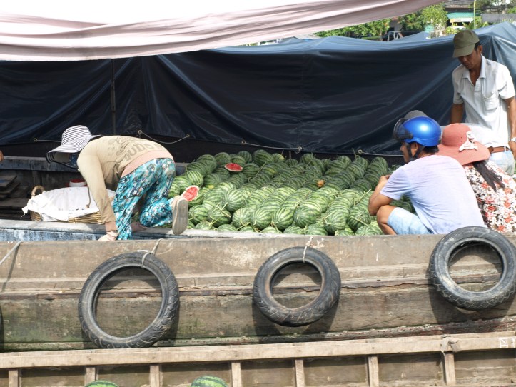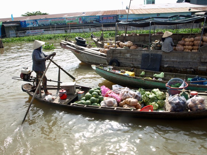 Le Mékong véhicule sur ses eaux un marché permanent : d’une province à l’autre, les marchandises transitent, s’échangent, puis rejoignent les marchés terrestres des villes et villages. Nous avons d’abord découvert le marché flottant de Cai Rang, où les bateaux proposent fruits, légumes, soupes, poissons…Sur le mât, on voit ce qui est vendu sur le bateau !