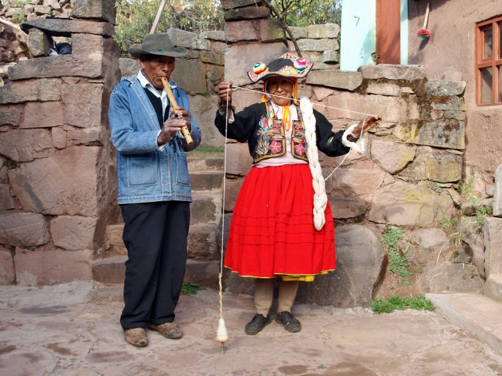 Après un bon petit-déjeuner servi par nos hôtes, et, pour nous, une démonstration de flûte et de filature, nous prenons le bateau pour les îles.