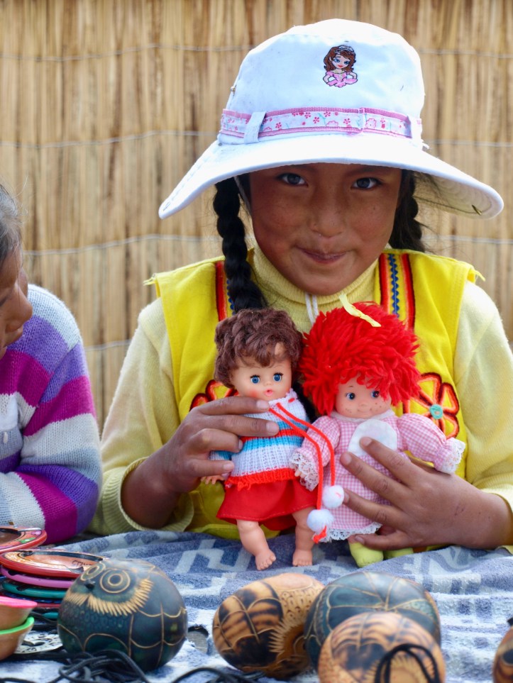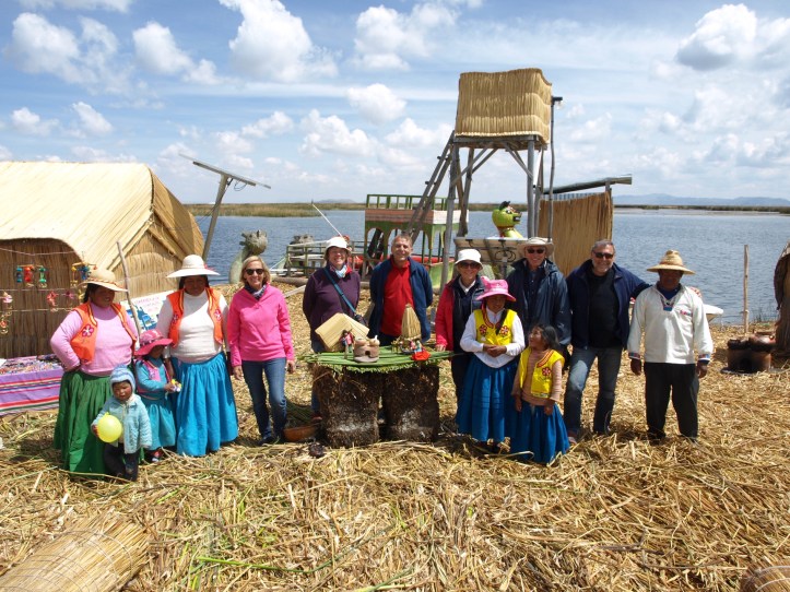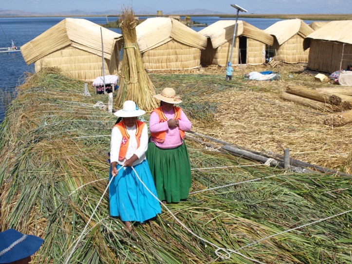 Nous visitons d’abord l’île flottante de Uros Titinos, construite en roseaux et sur laquelle vivent 20 personnes, de 5 familles. Ce sont des pêcheurs, mais qui vivent aussi beaucoup du tourisme : ils font visiter leurs maisons (pièce unique par famille et cuisine commune), et vendent les produits de leur fabrication.
