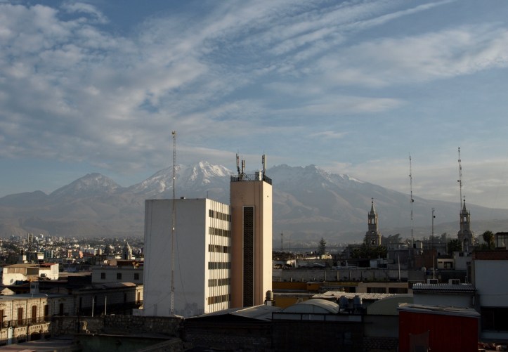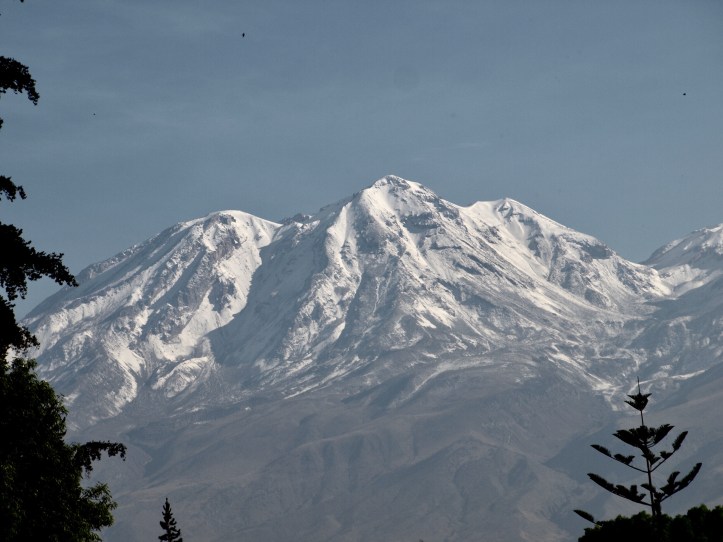 Avant de partir, le soleil étant revenu, nous pouvons apercevoir les volcans Misti et Chachani.