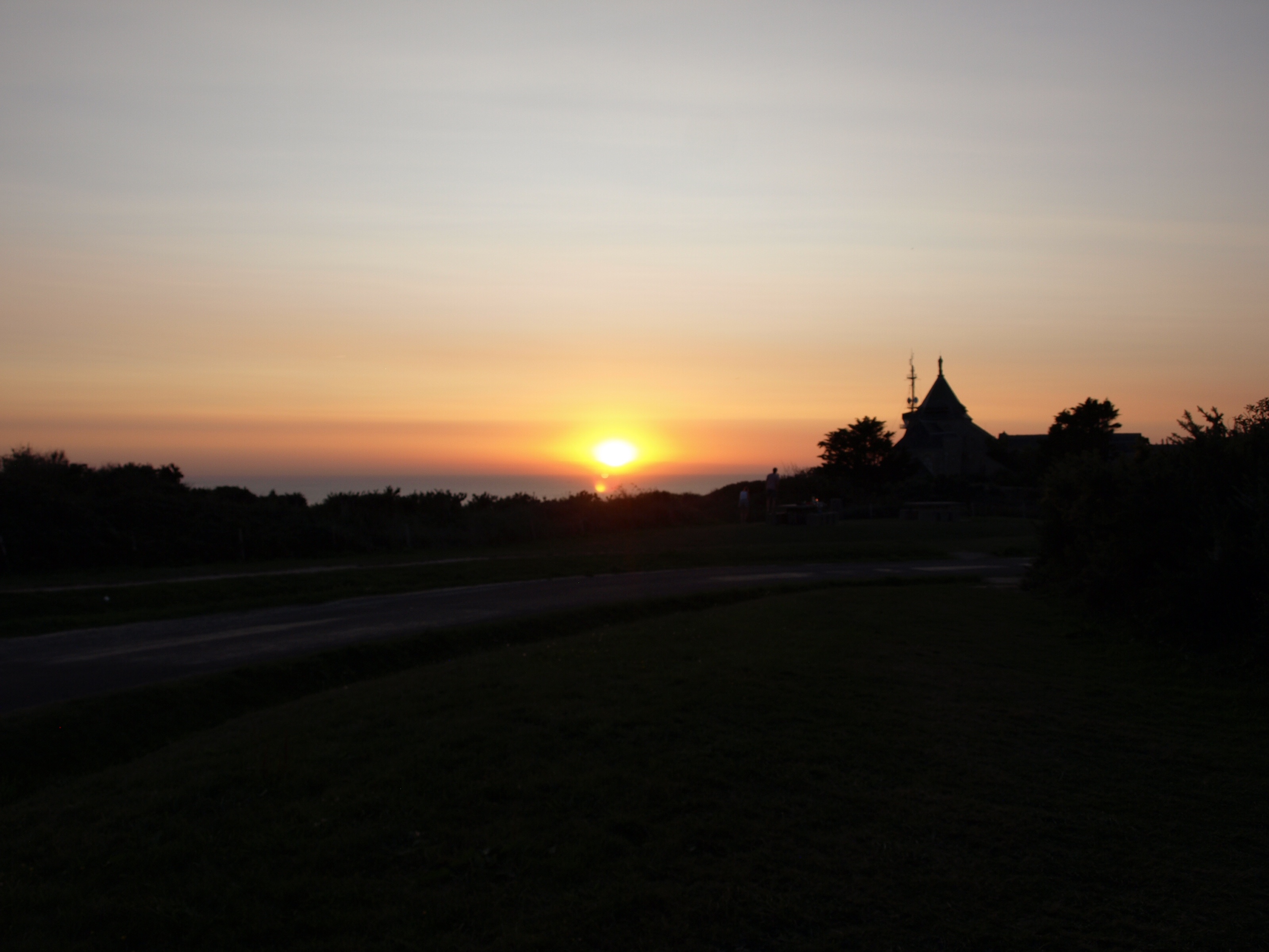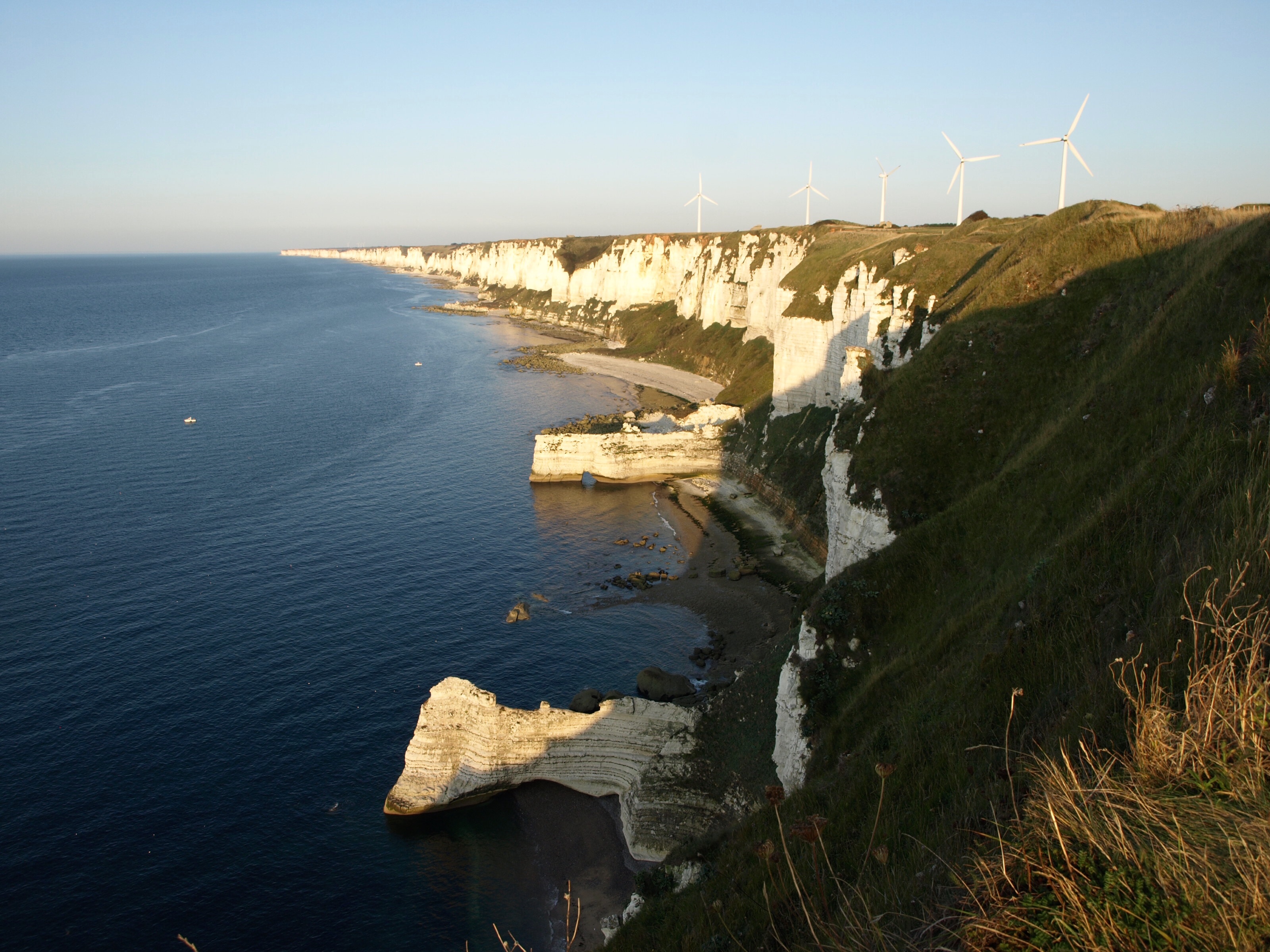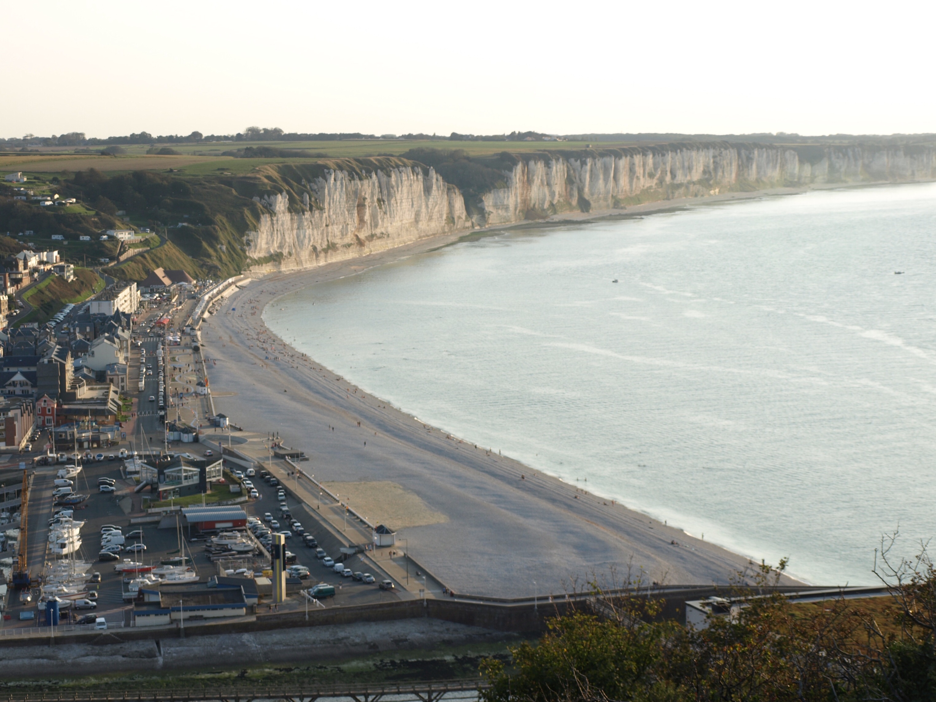 Le camping-car est vite prêt, et nous partons en début d’après-midi vers la côte pour notre première étape : Fécamp, où nous stationnons sur un parking au cap Fagnet, près du phare, avec une vue magnifique sur la ville, les falaises et la plage. Il y a du vent, ce qui doit être habituel vu le nombre d’éoliennes ici, qui fournissent en électricité la moitié de la ville. Près de nous se trouve l’église Notre Dame du Salut, où venaient prier les pêcheurs avant de partir en mer. Mais aujourd’hui, Fécamp est davantage un port de plaisance que de pêche.