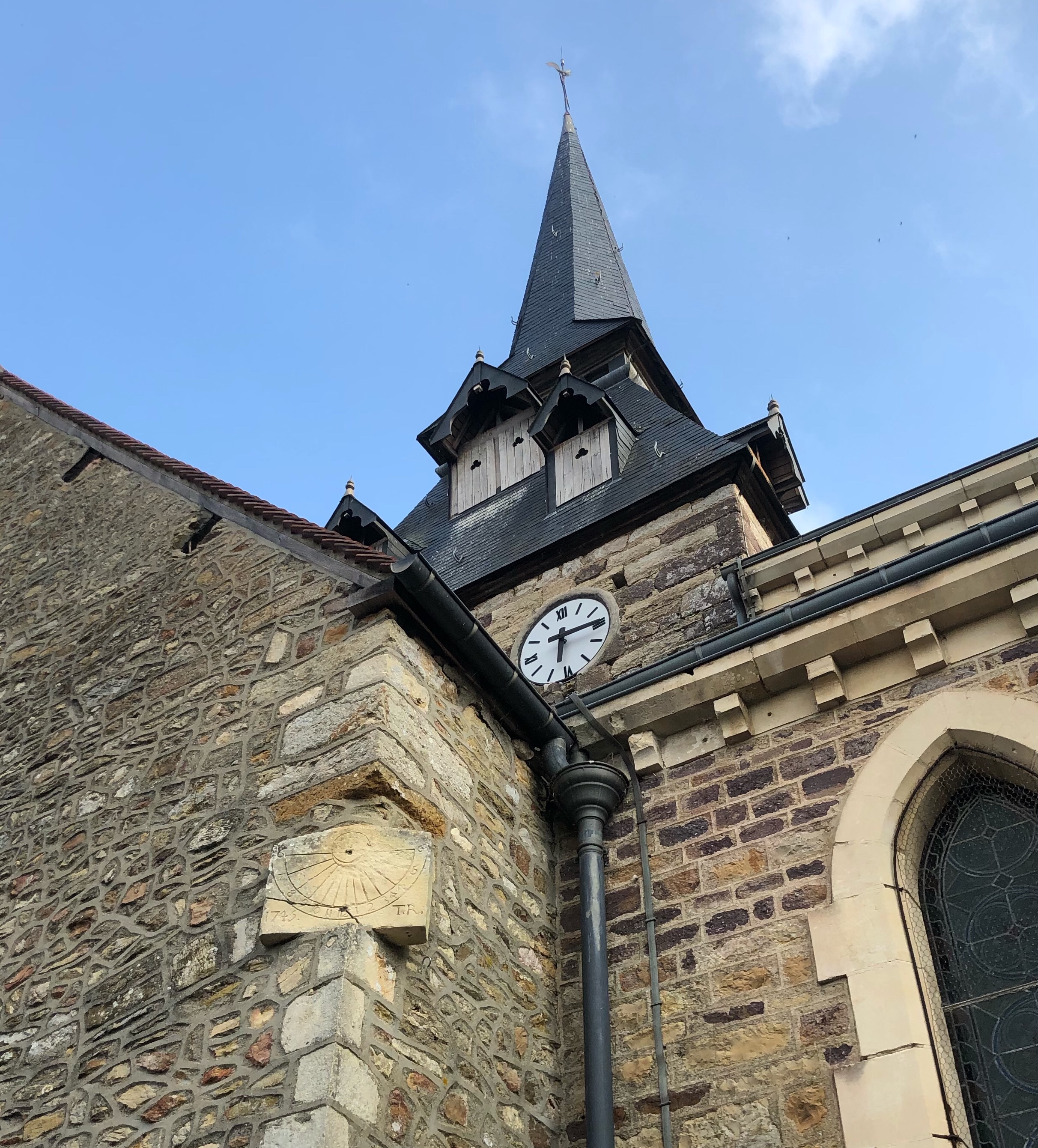 Saint Pierre de Clécy, ancienne place forte moyenâgeuse transformée en église au XVème avec ajout d’un clocher, puis d’un cadran solaire au XVIIème.