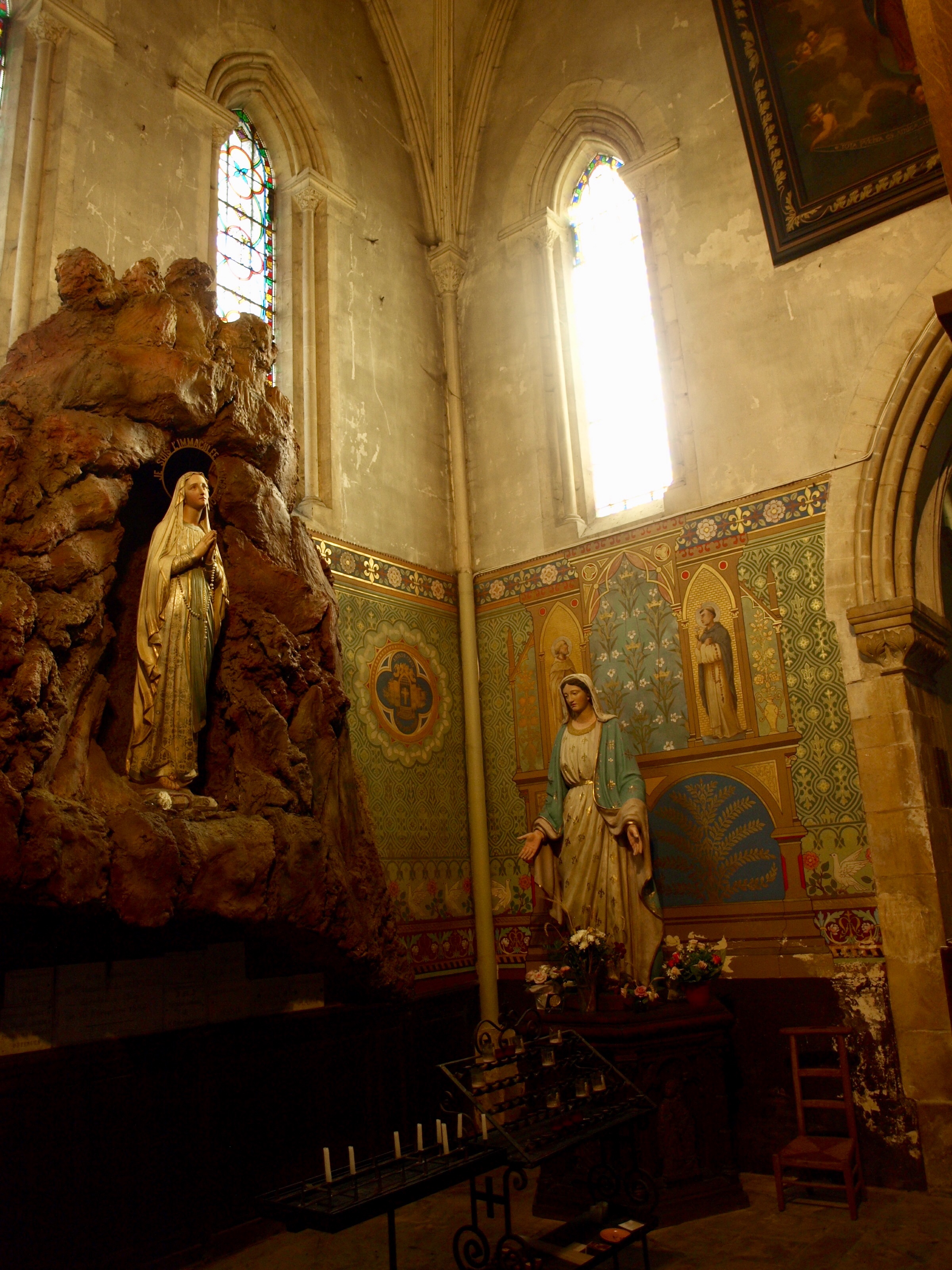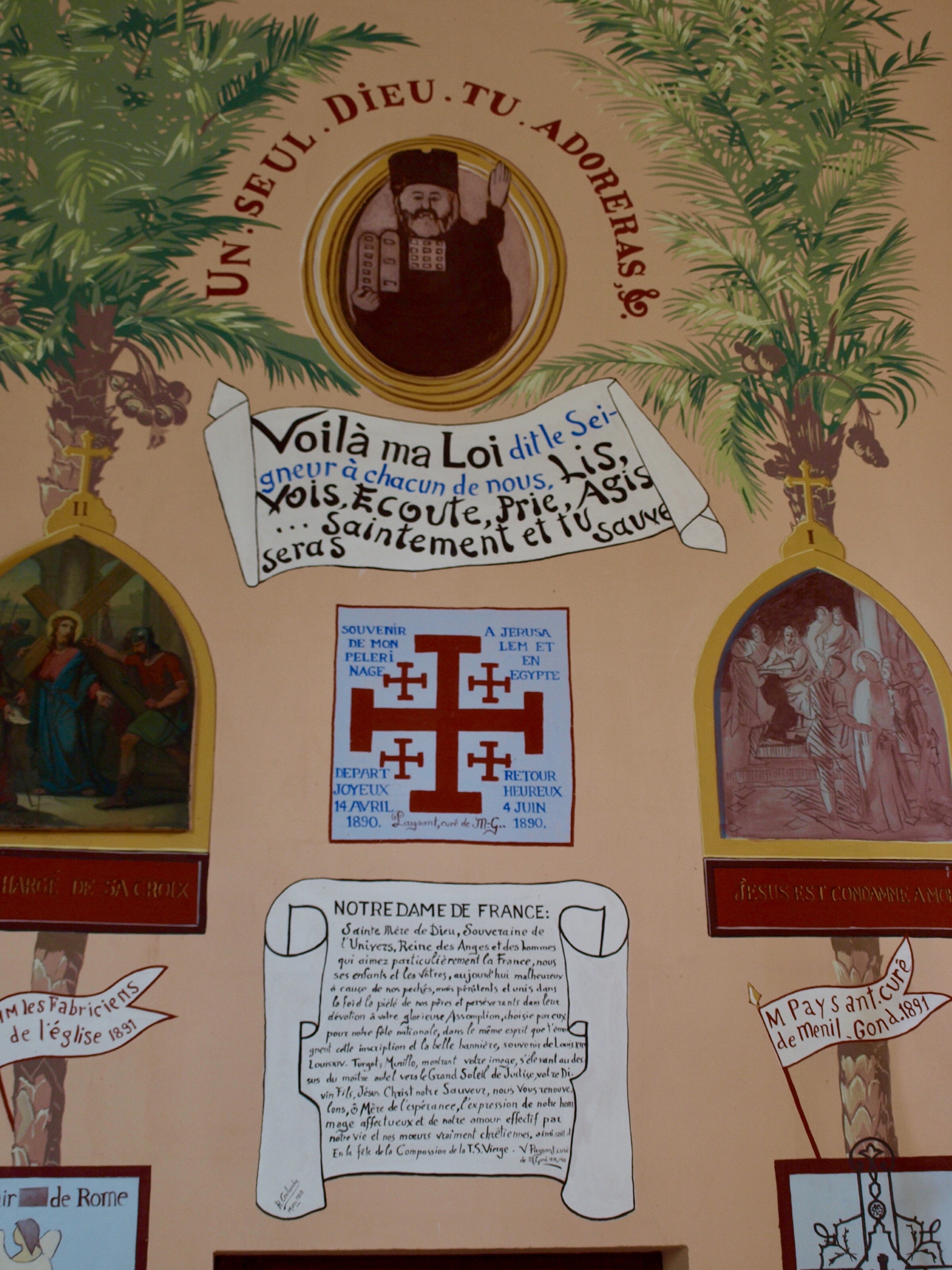 L’église de Ménil-Gondouin, œuvre du Père Paysant, construite au début du XXème siècle, et décorée telle un musée de la chrétienté ou un livre de catéchisme. Il a beaucoup voyagé et rapporté objets et récits dont il a voulu orner son église.