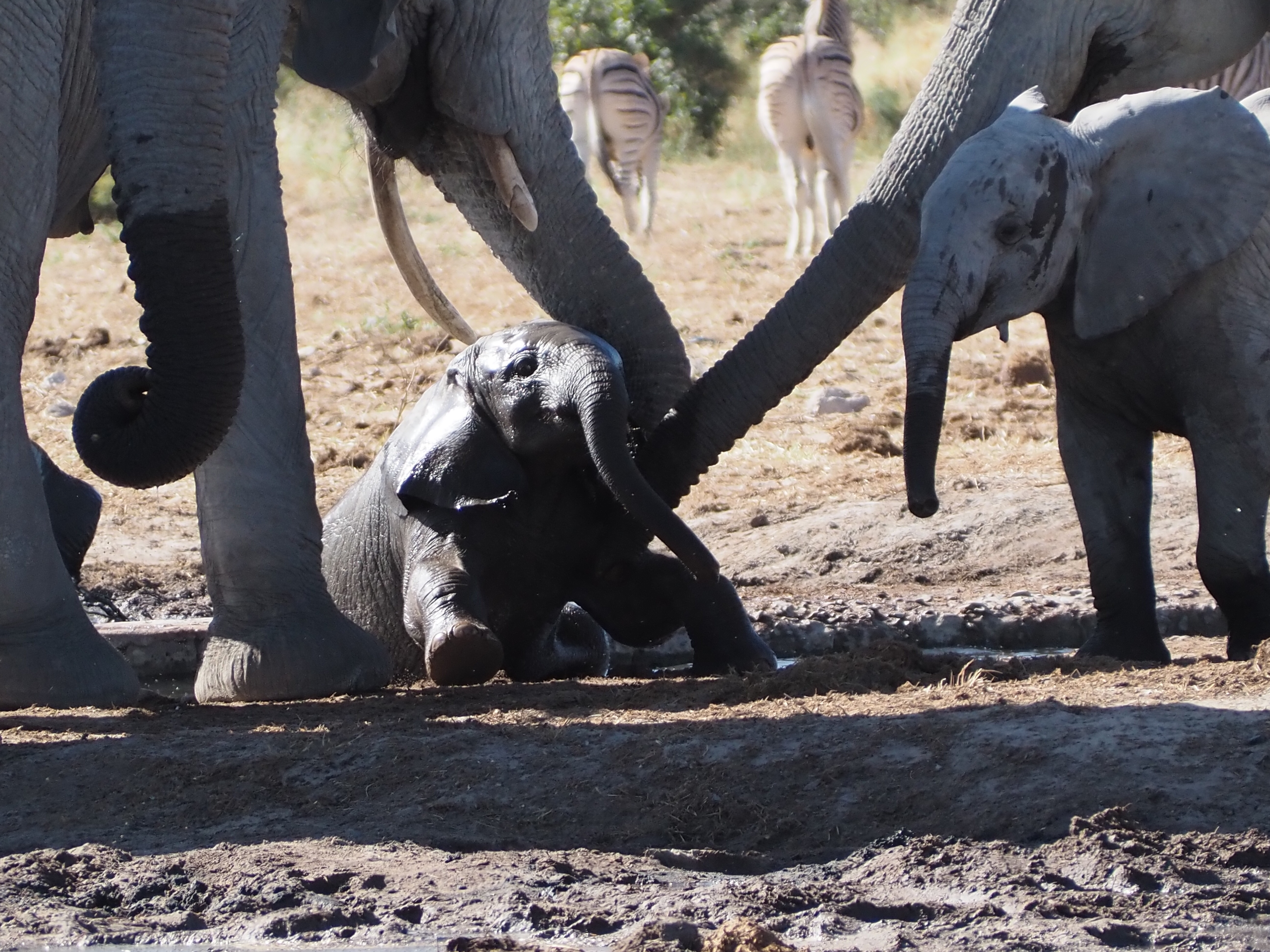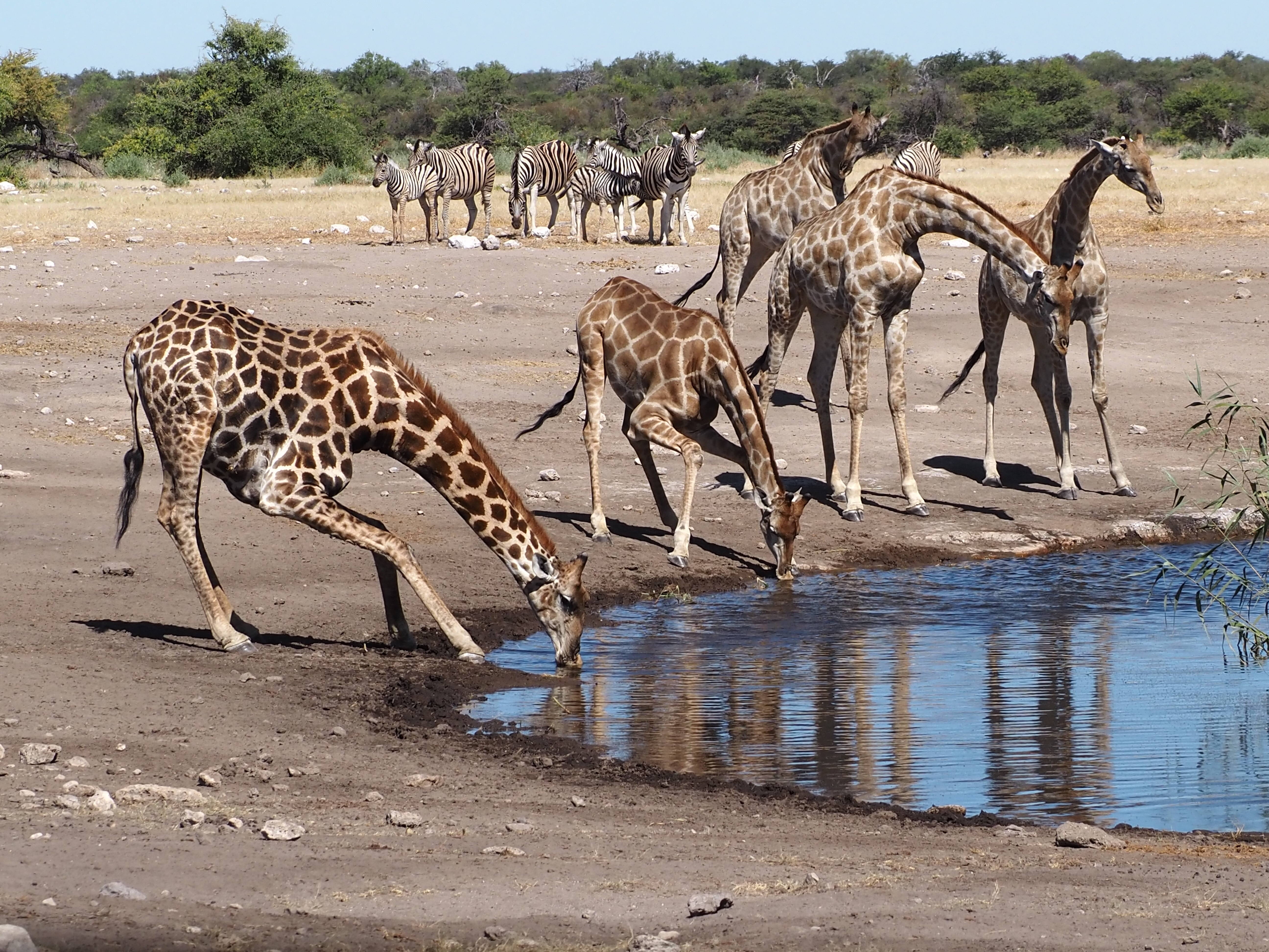 L’après-midi, nous croisons de nouveau la route d’un troupeau d’éléphants qui va boire, avec des éléphanteaux qui jouent dans l’eau (l’un d’eux a failli se noyer !). Puis les girafes boivent à leur façon !