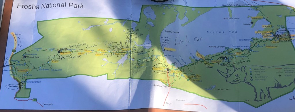 Nous avons réservé 4 nuits dans le Parc National d’Etosha, où nous pouvons librement sillonner les pistes et traquer les animaux du lever au coucher du soleil (cad de 7h15 à 18h environ), à condition de ne pas descendre de voiture !
