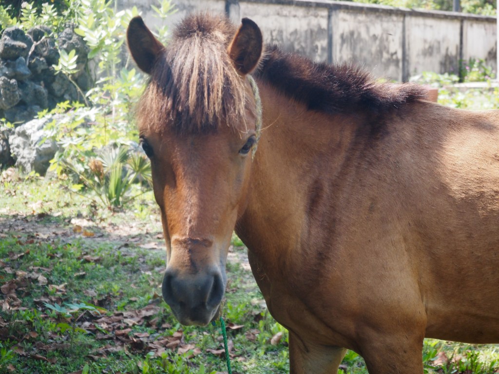 Arrivés sur l’île, nous louons une camionnette avec chauffeur pour avoir un aperçu de l’île. Quelques vestiges de l’époque hollandaise, une trace de pas d’Hanuman, et surtout les chevaux sauvages que nous pensions voir en grand nombre. Nous n’en avons vu que quelques uns car ils étaient à l’ombre dans la forêt. Au final, 2 heures de parcours à sauter dans la camionnette sur une route chaotique pour pas grand chose. L’île ne compte plus que 5000 habitants, pêcheurs pour la plupart, et les 2000 chevaux présents sur l’île sont des descendants des pur-sang importés par les Portugais.