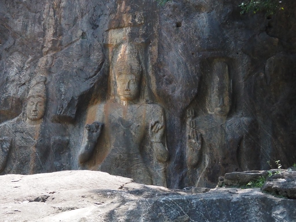 Le site de Buduruwagala n’est pas très fréquenté et un peu hors des circuits touristiques, mais vaut vraiment un arrêt. Les statues de 7 Bouddhas sont sculptées dans le rocher. La plus grande mesure plus de 15 m, et les 6 autres entre 6 et 7 m. Les historiens ne sont pas tous d’accord pour dater ces statues, sans doute entre le VIIè et le Xè siècle.