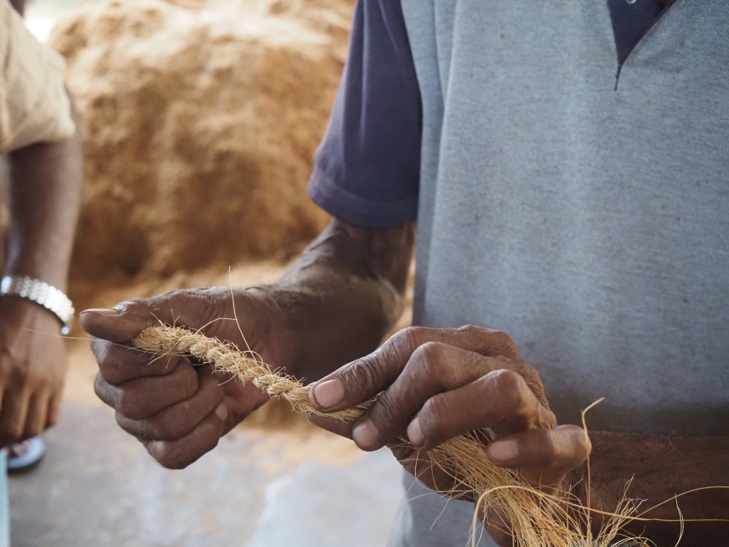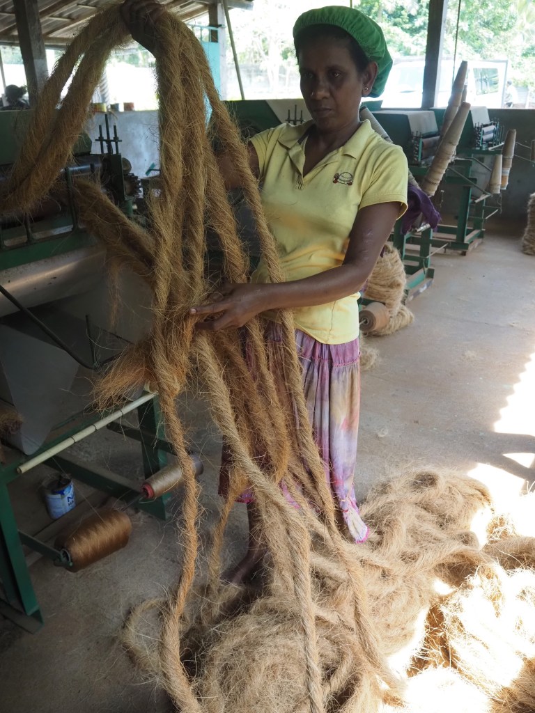 Arrivés à Bentota, nous allons visiter une petite corderie qui utilise les fibres de noix de coco. Tout est utilisé dans ces fruits : jus, chair, coque et fibres. Ces cordes servent à faire des tapis ou paillassons. Les déchets (petites poussières) sont vendus comme compost.