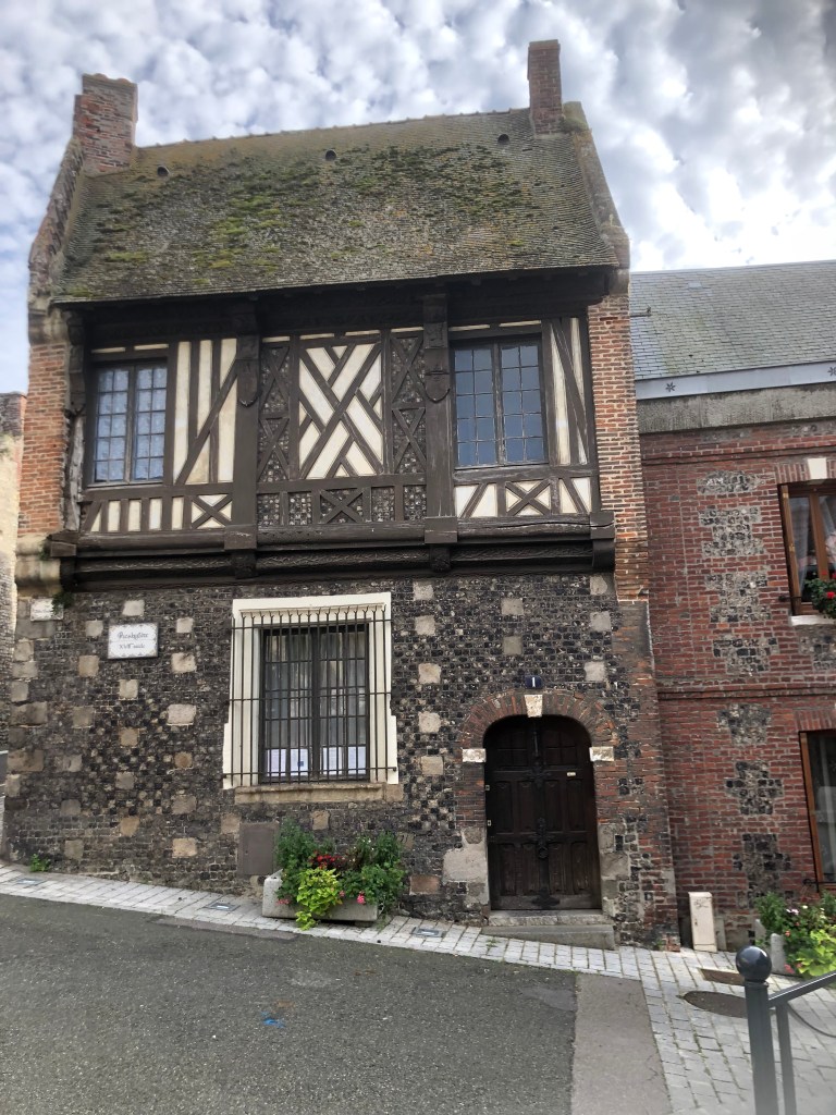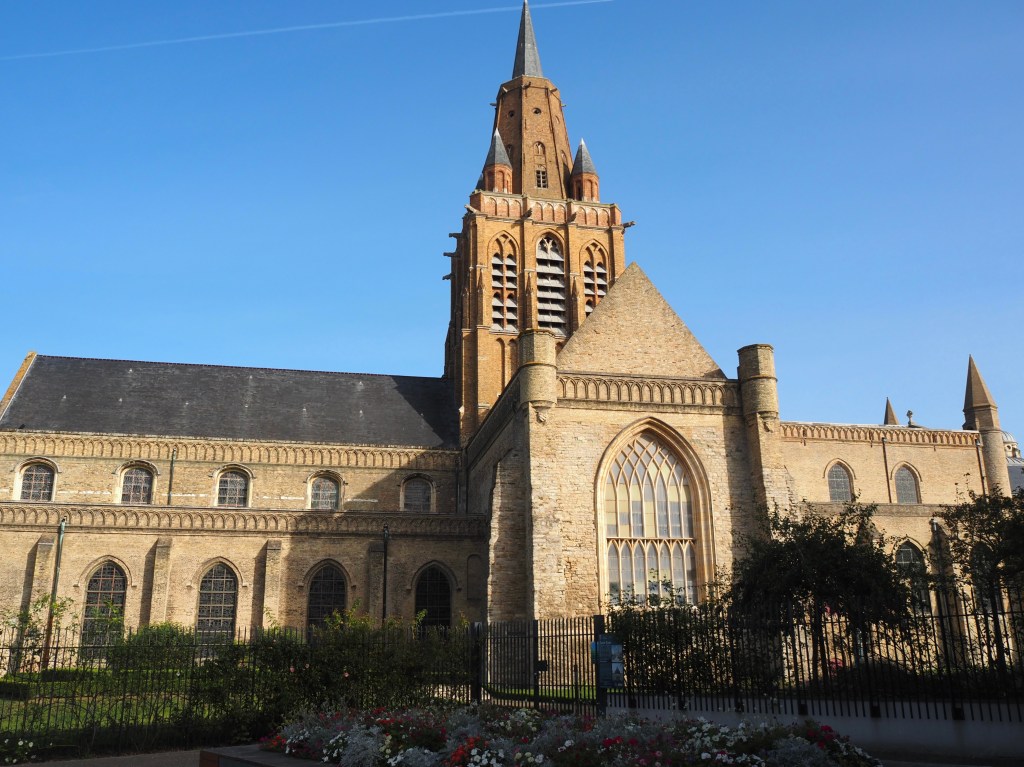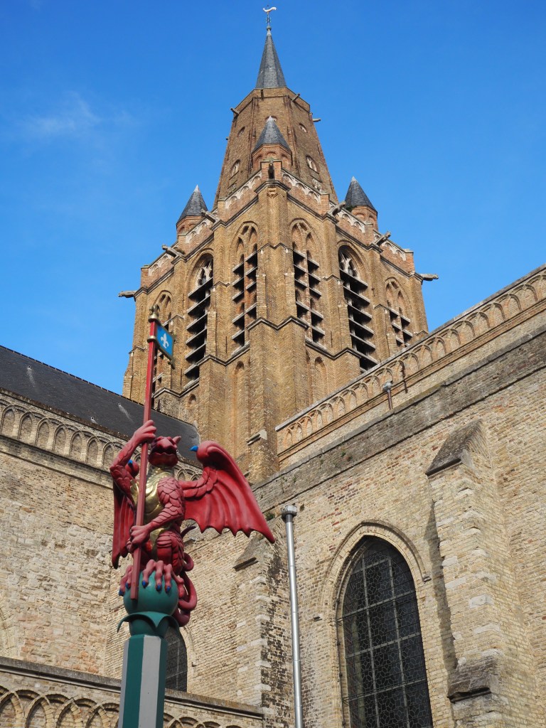 Nous montons par les ruelles étroites jusqu’à l’église Saint-Jacques, typique de la région, avec ses façades en damiers de grès sombre et silex.
