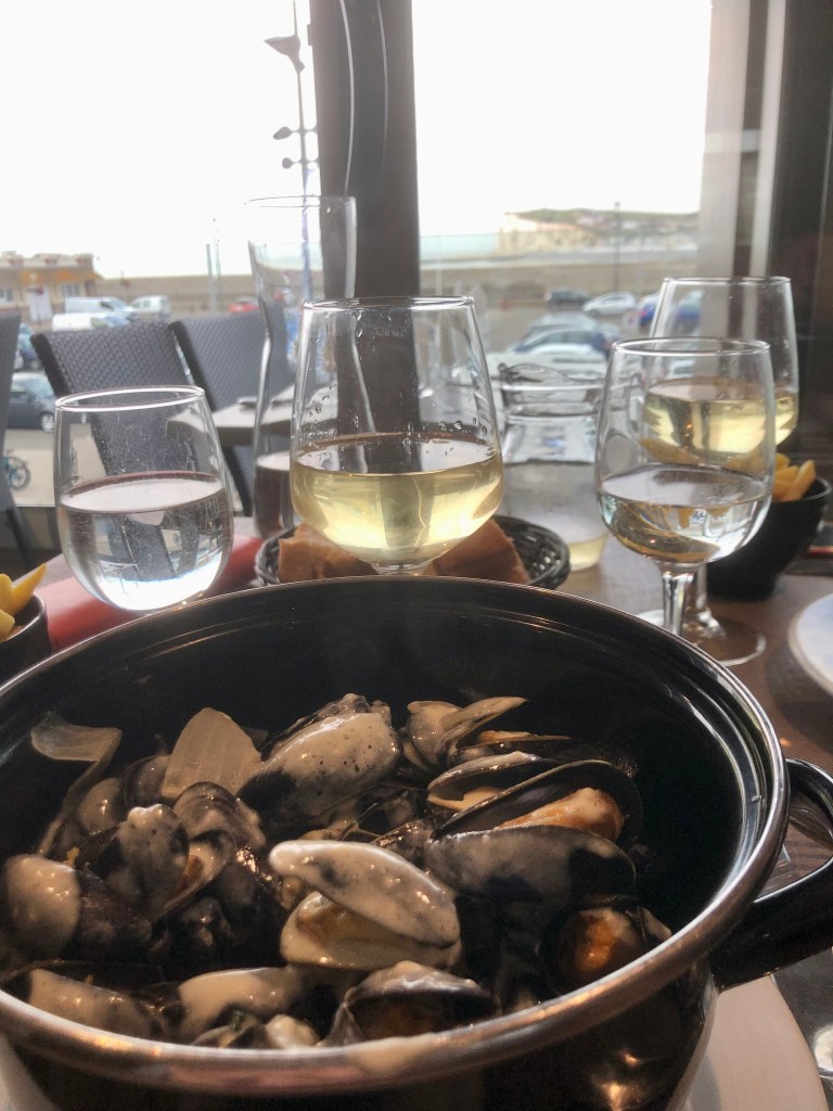 La poissonnerie municipale, sur le quai, fait face aux nombreux restaurants qui proposent tous moules frites, ou autres plats de la mer. Nous testons « La Calypso », et nous ne sommes pas déçus. Il fait encore bon, alors il y a du monde, surtout des retraités, bien sûr.