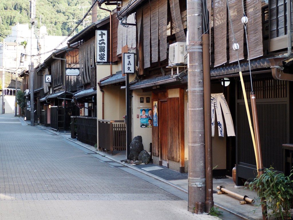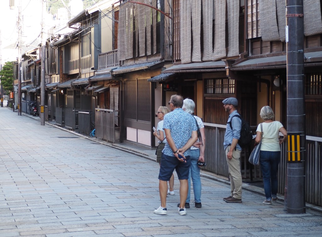En fin d’après-midi, nous découvrons le quartier de Gion, quartier connu surtout pour les spectacles de geishas. Maxime nous explique comment reconnaître les maisons (okiya), et le rôle et la formation des maiko ou apprenties des arts. C’est dans ce quartier que nous commençons à ressentir le surtourisme dont Kyoto est victime.