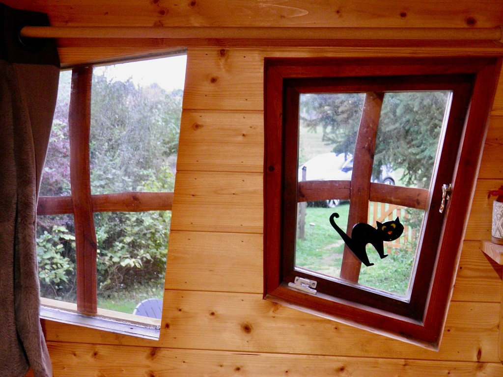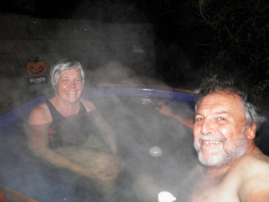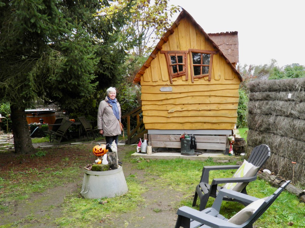 Nous partons maintenant découvrir notre hébergement du soir. Il faut traverser un champ, et on arrive devant une petite maison toute biscornue, décorée pour Halloween, et, dans le jardin, nous découvrons notre activité surprise du soir : un bain nordique !