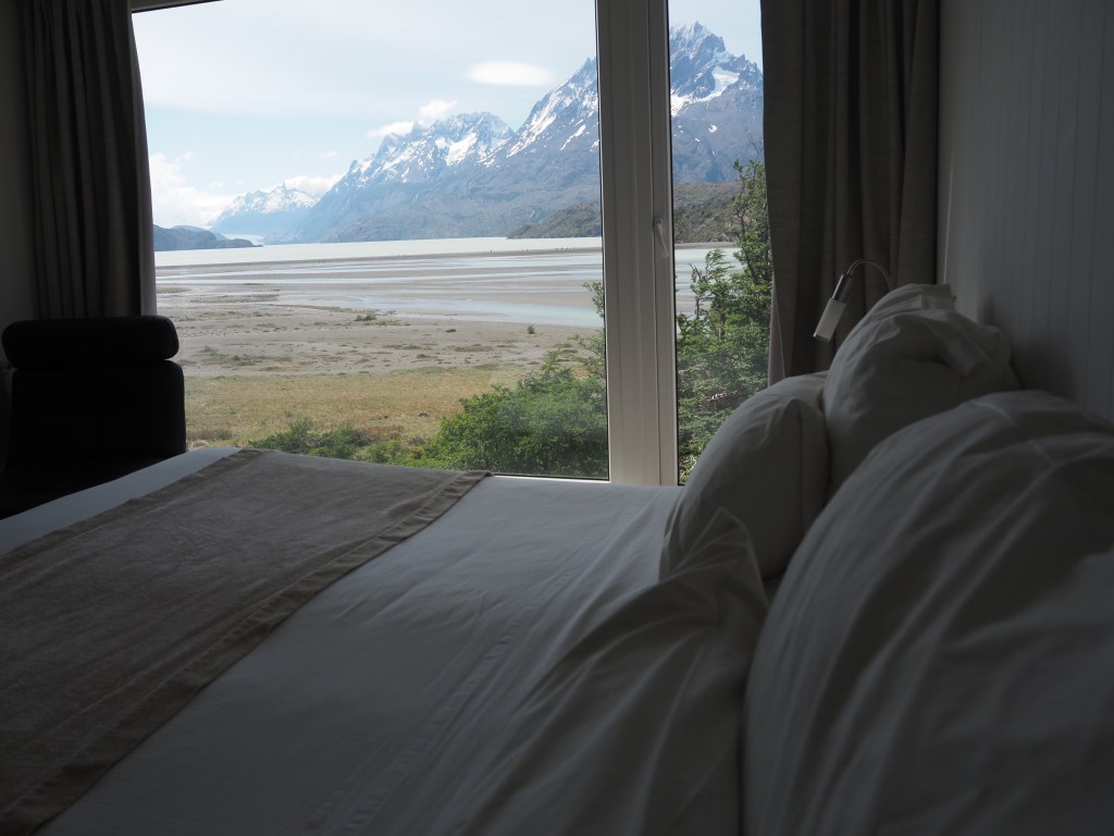 Ce soir, c’est une étape de luxe avec chambre avec une vue exceptionnelle. Nous allons nous endormir en regardant le glacier Grey ! Quel privilège !