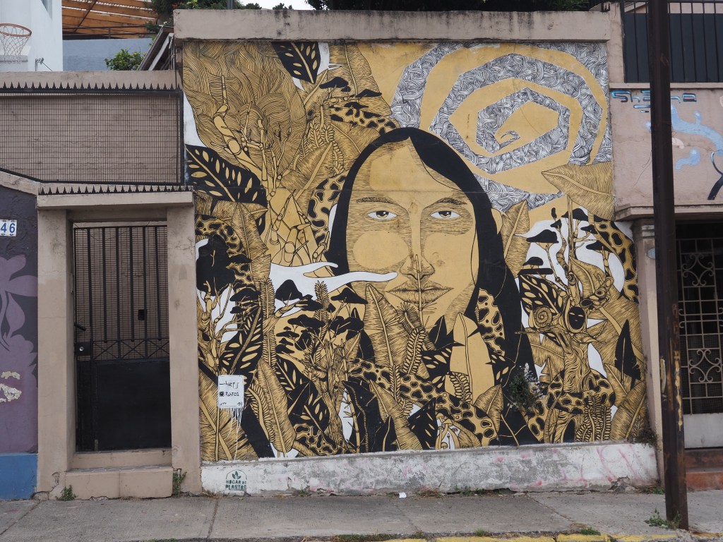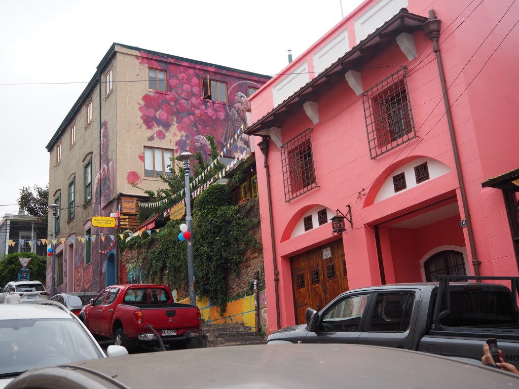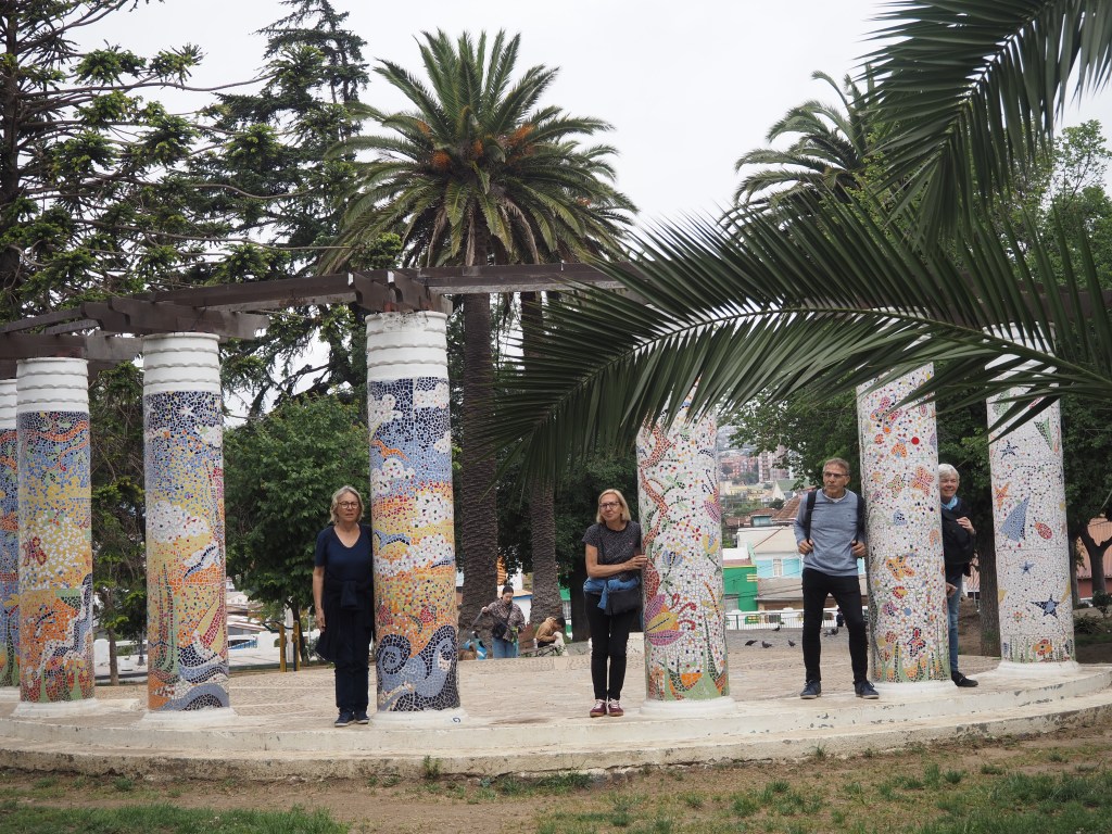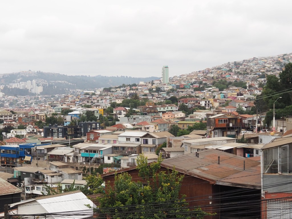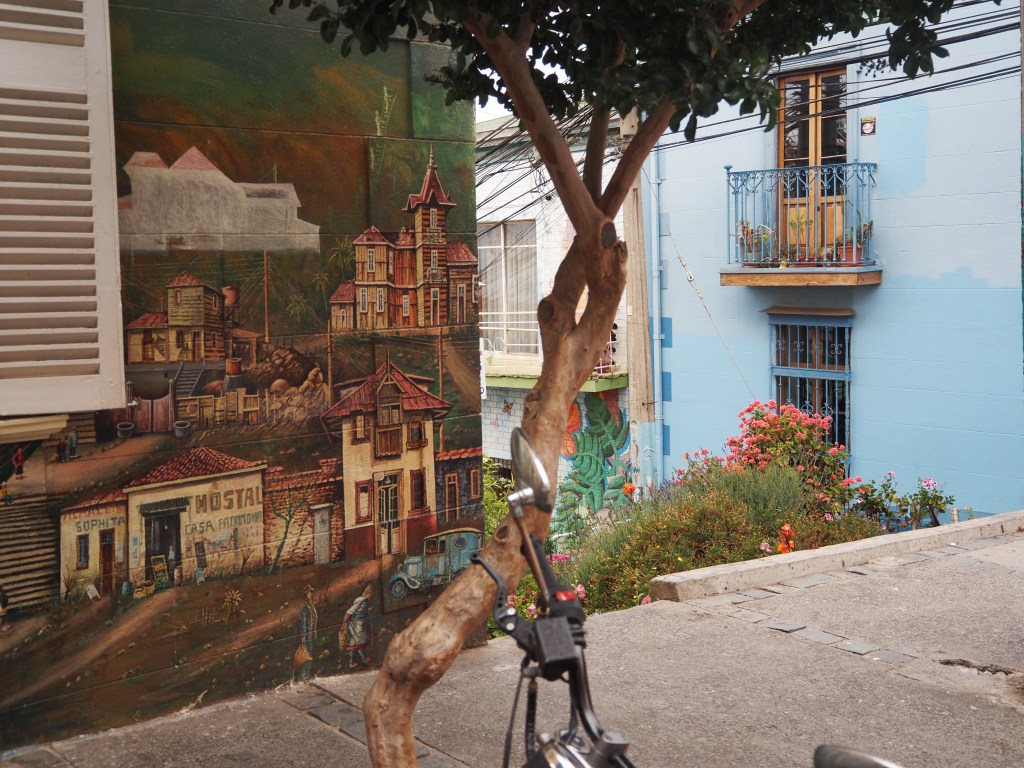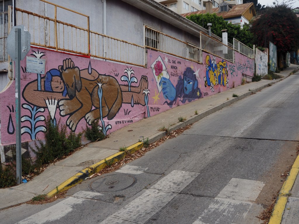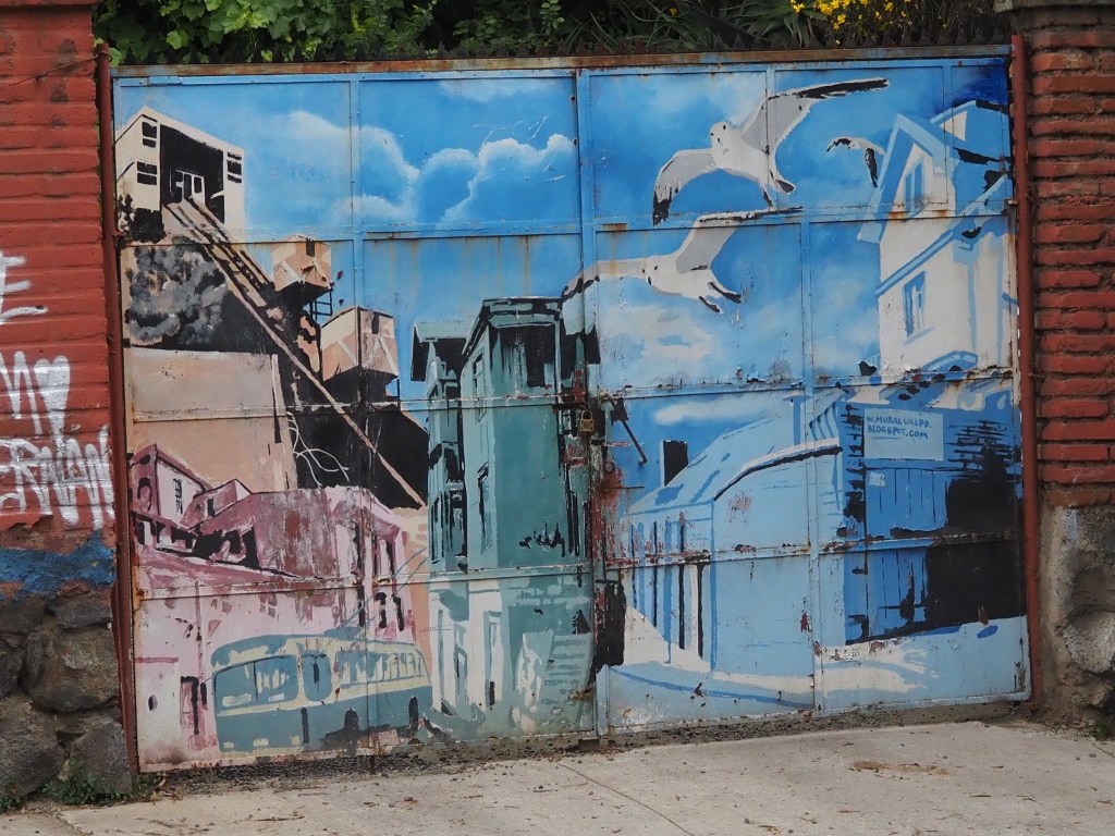 Ce fut le plus grand port d’Amérique latine au début du XXème siècle, et les installations portuaires sont toujours là. Mais après l’ouverture du canal de Panama, ce fut la chute et s’ensuivit la paupérisation. Aujourd’hui, la vieille ville est progressivement réhabilitée, notamment les quartiers Alegre et Concepción, qui sont des quartiers branchés. Mais dès qu’on s’éloigne un peu des rues touristiques, c’est la saleté et l’insécurité qui prennent le dessus. Tout le monde nous met en garde : pas de téléphone ou d’appareil photo visible ! Demain nous aurons un guide, mais, aujourd’hui, nous avons juste parcouru un petit bout de la rue Alemania et les rues en pente du cerro Alegre touristique, pour voir quelques peintures murales.